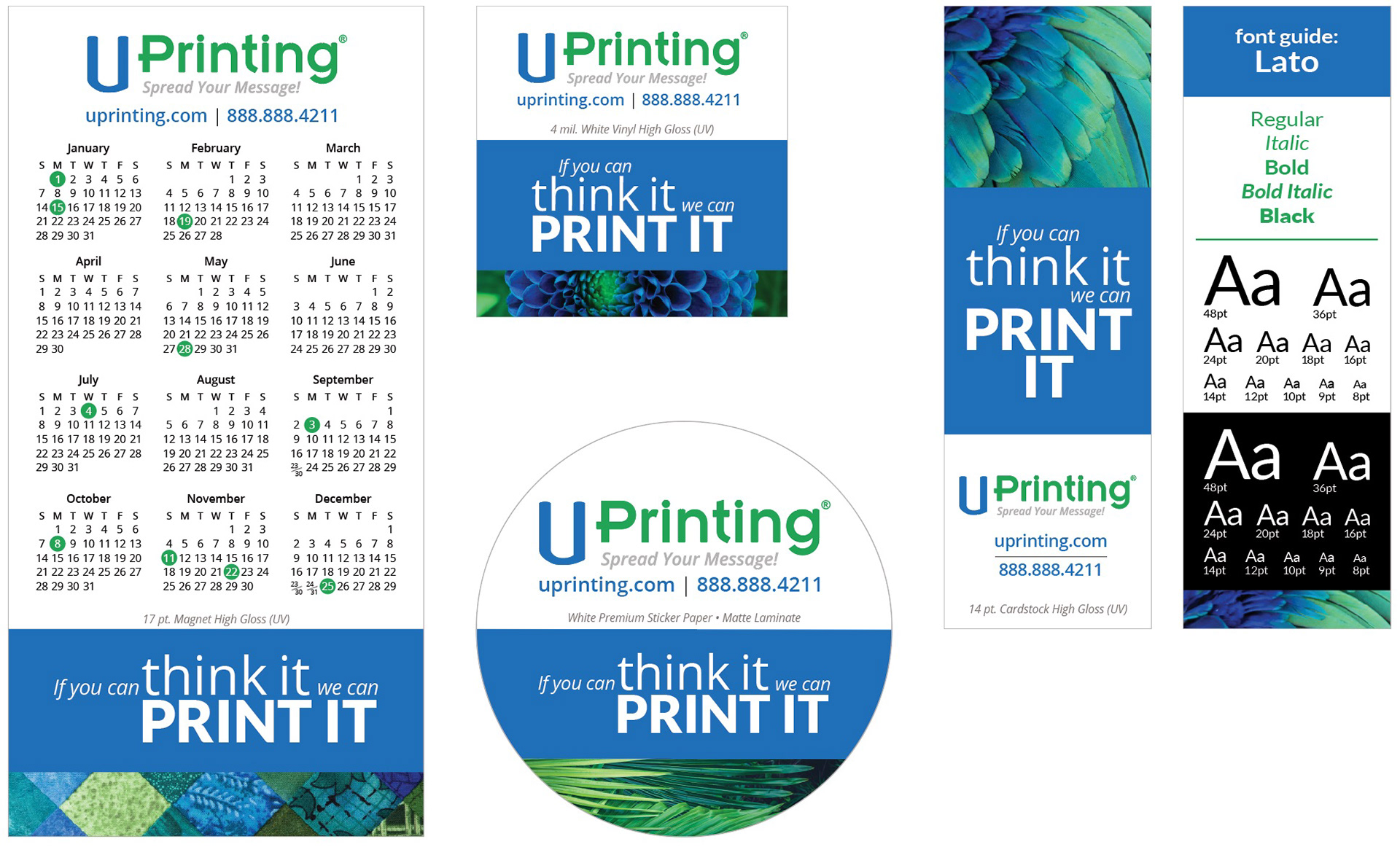 Set of printed product samples consisting of a magnet calendar, bookmark, and 2 assorted stickers for each of Digital Room’s top 5 online printing brands